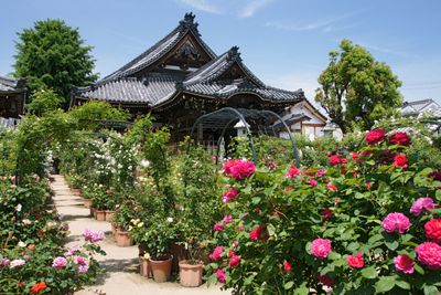 The temple grounds contain 2,300 types of roses across its gardens, combined with traditional Japanese architectural elements and ponds with koi fish.