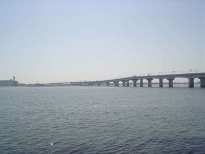 The construction of this maritime railway bridge started in March 2001 and reached completion in January 2004, managed by the Japan Railway Construction Corporation.