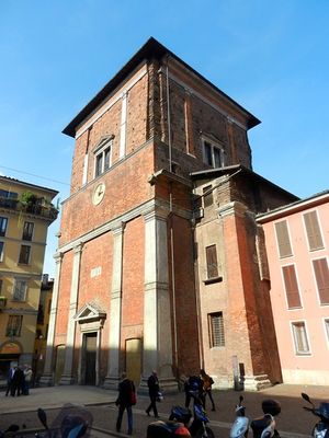 The Trivulzio Mausoleum stands as a red brick structure with a square exterior and octagonal interior plan next to San Nazaro Maggiore Basilica.
