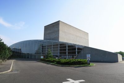 The building incorporates elements of contemporary architecture while maintaining a connection to traditional Japanese design principles through its structural composition.