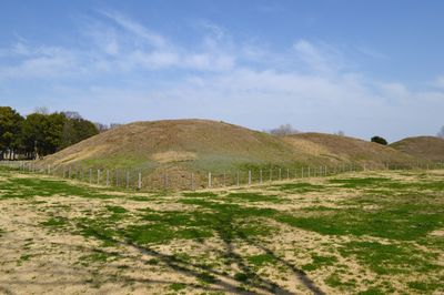 The Okunoyama Kofun measures 70 meters in length with a circular portion of 43 meters in diameter and a rectangular section reaching 7.4 meters in height.