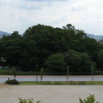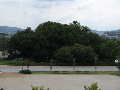 The Minegazuka Kofun extends 96 meters in length with a circular rear section of 56 meters diameter and a rectangular front section of 74.4 meters width.
