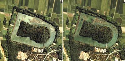 The moat system around the tomb currently functions as an agricultural reservoir, creating a distinctive island-like appearance for the burial mound.