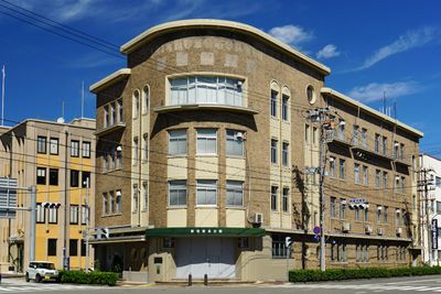 The Shinkō Trade Hall is a 1930s trading building with typical Art Deco features like clean lines, geometric shapes, and decorative patterns. The structure uses reinforced concrete and shows thoughtful space planning that works for both commerce and public gatherings.