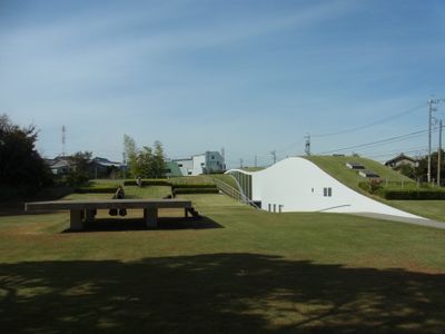 The museum building incorporates grass-covered surfaces and underground sections, reflecting the natural landscape of the Chita Peninsula through its architecture.