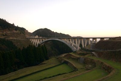The Oboro Bridge spans 293 meters across the Hirokawa Valley, featuring a steel arch structure rising 70 meters above the valley floor.