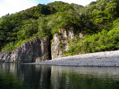 The Dorokyo Canyon extends through three prefectures along the Kumano River system, featuring steep cliffs and massive rock formations spanning 2.5 kilometers.