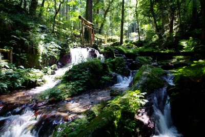The water flowing from the rocks creates a small cascade surrounded by moss-covered stones and dense forest in Wakasa Uriwari Meisui Park.