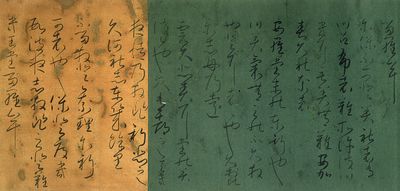 Created between the 10th and 11th centuries, this National Treasure of Japan contains texts written in cursive Japanese script during the transition from Manyogana to Hiragana.