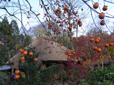 The clay-walled building with thatched roof sits among persimmon trees, displaying traditional Japanese architecture without the use of metal nails.