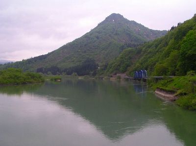 Mount Gamou rises to an elevation of 828 meters, featuring steep rocky formations and offering views of the Tadami River flowing through the valley.