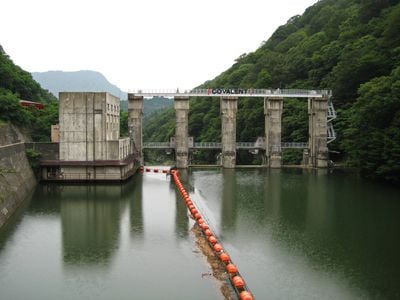 The Akashiba Gorge extends along the Arakawa River, featuring vertical cliffs, dense forests, and multiple hiking trails through the mountainous terrain.