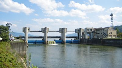 The Kamaguchi Floodgate is a sluice near Okaya that diverts water from Lake Suwa into the Tenryu River. The structure manages flows from multiple tributaries into one river system, maintaining water control across the region.