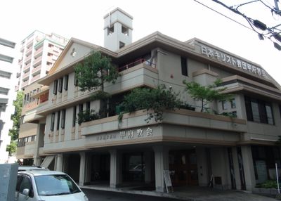 The Kofu Church building features traditional architectural elements with a white exterior and pitched roof, located near residential neighborhoods in Marunouchi.
