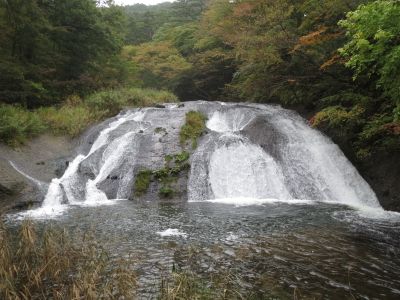 The Kamabuchi Falls cascade over a large rock formation, reaching 8.5 meters in height and extending 30 meters across the Tai River in Hanamaki.