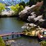 Mobara Park extends across 160,000 square meters of land, featuring 2,850 cherry trees, landscaped paths, and a central pond with vermillion bridges.