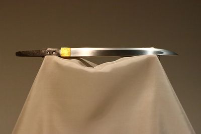The steel blade demonstrates specialized forging methods that produced weapons combining practical functionality with refined metallurgical techniques of thirteenth-century Japan.