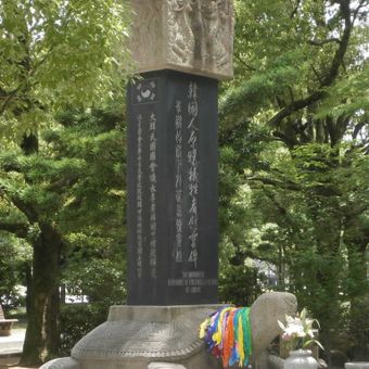 The Monument in Memory of the Korean Victims of the A-bomb is an obelisk with a turtle base and two dragon sculptures crowning its top, positioned in the center of Peace Memorial Park. It honors thousands of Korean individuals who died when the atomic bomb fell on Hiroshima.