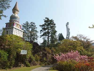 The interior of the Guze Dai-Kannon statue includes stairs leading to its head, offering an unusual perspective of the surrounding landscape.