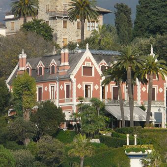 The Villa del Trattato features brick facades and English-inspired architectural elements, standing prominently in the coastal landscape of Rapallo.