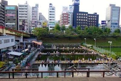 The fishing pools position directly next to the train platform of Ichigaya Station, creating an unusual mix of urban infrastructure and recreational fishing.