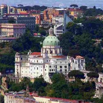 The Madre del Buon Consiglio rises on a hillside near Capodimonte Palace, featuring baroque revival architecture and a design inspired by Saint Peter's Basilica in Rome.
