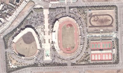 This 30,000-seat baseball stadium features standard field dimensions and multiple seating sections spread across its main structure in Kagoshima Prefecture.