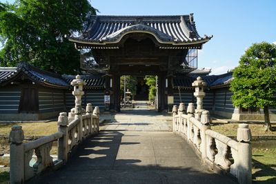Honsho-ji is a Buddhist temple in Takatsuki featuring traditional Japanese architecture with a distinctive eastern gate and buildings arranged in a classic layout. The structures stand within walled grounds that create separate spaces for meditation and ceremonial activities.