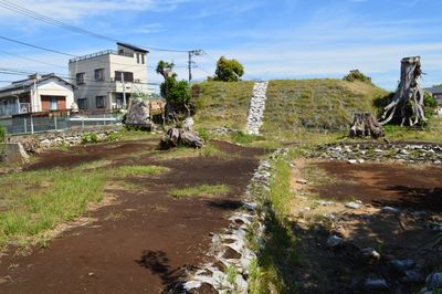 The archaeological site stands at the southern end of a ridge extending from Mount Ashitaka, with two Shinto shrines positioned on different sections.