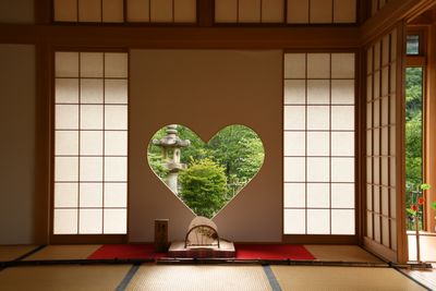 The temple complex features traditional Japanese architecture with a heart-shaped window in the guest hall that frames seasonal garden views through the year.