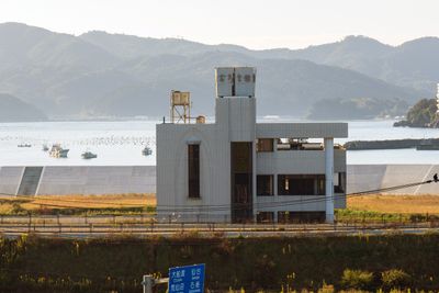 The Takano Kaikan building stands 300 meters from Shizugawa Bay and features a rooftop observation deck overlooking the reconstructed Minamisanriku town landscape.