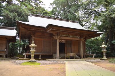 Sobataka Shrine is a Shinto shrine located in Katori featuring nagare-zukuri architecture, characterized by curved rooflines that extend over the front of the building and angled support beams. The roof design reflects the traditional style and creates a distinctive profile when viewed from the shrine grounds.