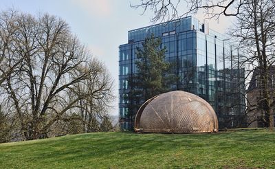 The sculpture consists of two perforated bronze hemispheres measuring three meters in height and six meters in diameter, positioned opposite each other.