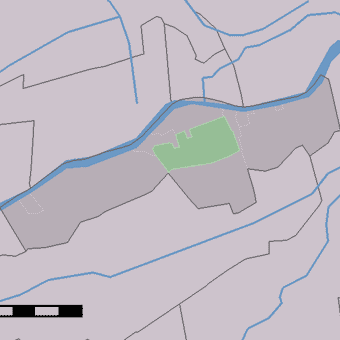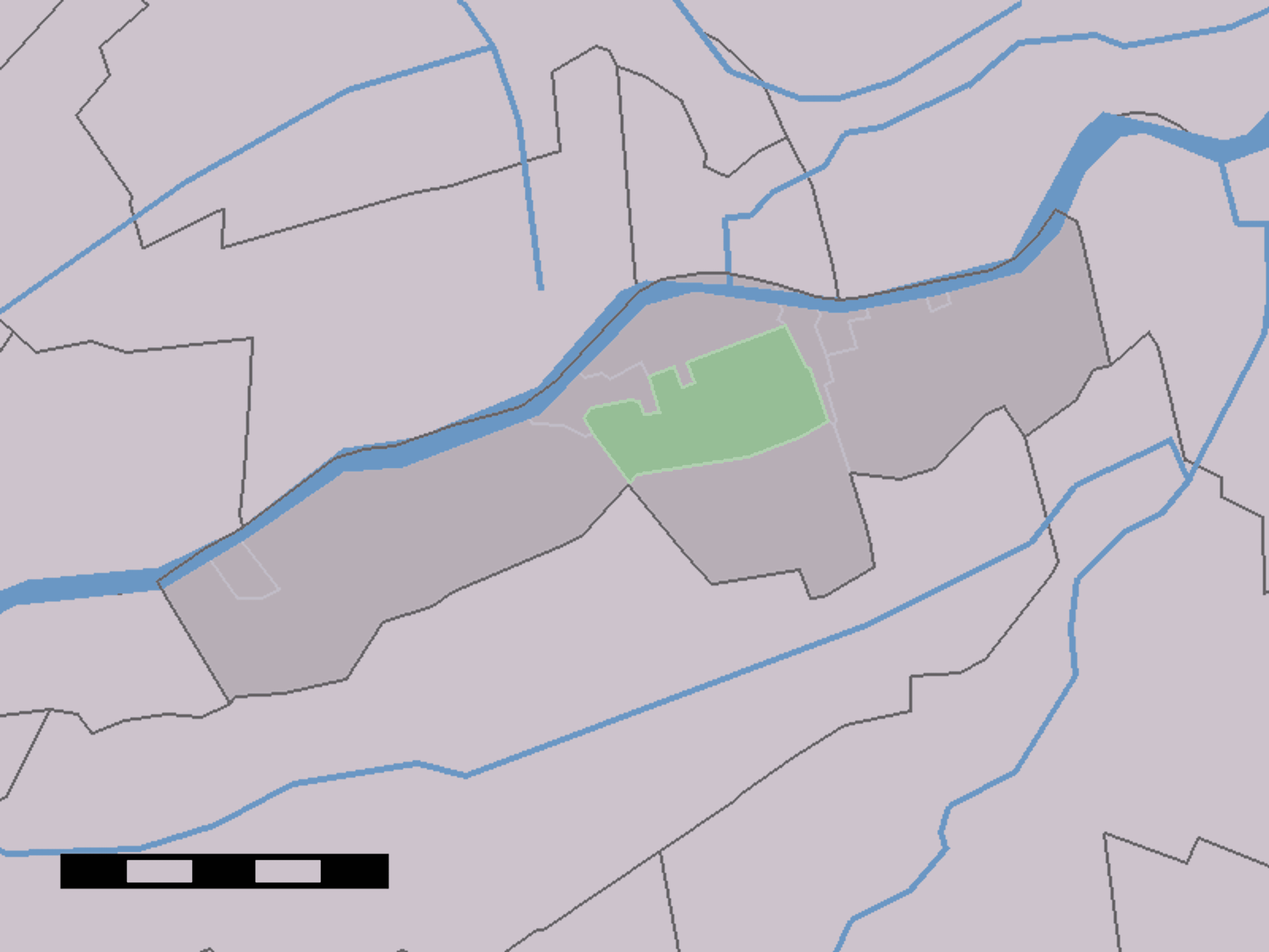 Boerderij, waarvan het woongedeelte een afgeknotte puntgevel met sierankers heeft en links een opkamer. Hogere houten stal onder een rieten dak met het woongedeelte