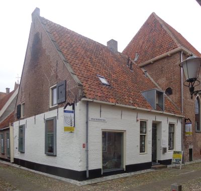 The synagogue occupies a building from the 16th century, featuring pointed arch windows and a high gable roof at Jufferenstraat 5.