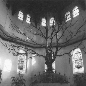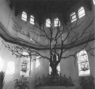 The oak tree within the church houses a statue of the Virgin Mary, surrounded by detailed architectural elements and devotional offerings from pilgrims.
