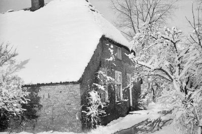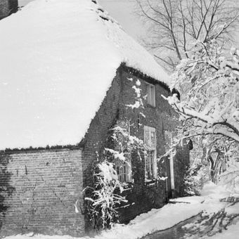 Boerderij met dwarshuis en langsdeel onder rieten wolfdak. Kruiskozijn met onderluiken