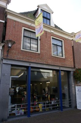 Pand onder diep zadeldak tegen oude achtergevel van puntvorm, building in Enkhuizen, Netherlands
