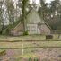 Zonnebeek: ommuurde moestuin met tegen de muur aan gebouwde houten schuur