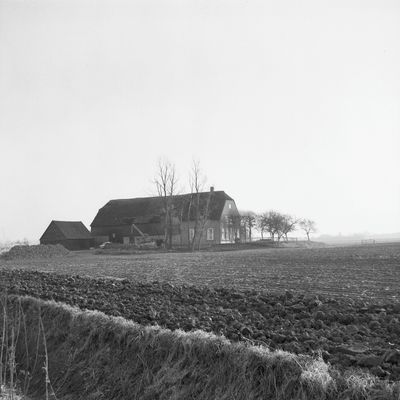 Boerderij, bakstenen gebouw met T-vormig woongedeelte en bedrijfsgedeelte met dwarsdeel en deeldeuren in kapel