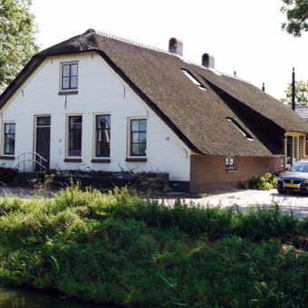 Boerderij, dwarshuis, gepleisterd, topgevels, dak rietgedekt