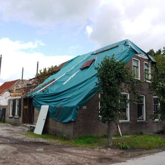 Boerderij, dwarshuis, gepleisterd, topgevels, dak rietgedekt