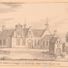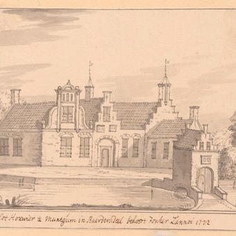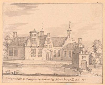 Woning met drie zestienruitsvensters onder schilddak met hoekschoorstenen met borden