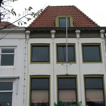 Perceelsgedeelte met gepleisterde rechte gevel. Gootlijst op klossen. Schilddak. Kelderluik