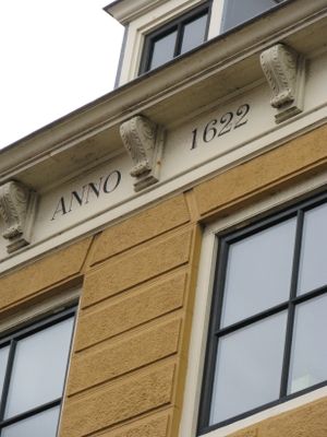 Gotische korfboog aan de zijde van de Beursstraat doorgang afsluitend bewerkte sleutelstukken. De boog ontspringt op gebeeldhouwde draagsteentjes (waarvan een verdwenen). Twee schamppalen