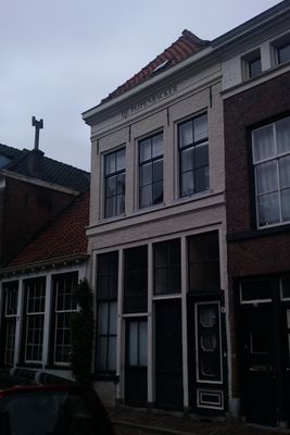 Pakhuis met aan de gasthuissteeg een puntgevel met ezelsruggen en bakstenen tweelichtskozijnen