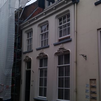 Pakhuis met aan de gasthuissteeg een puntgevel met ezelsruggen en bakstenen tweelichtskozijnen