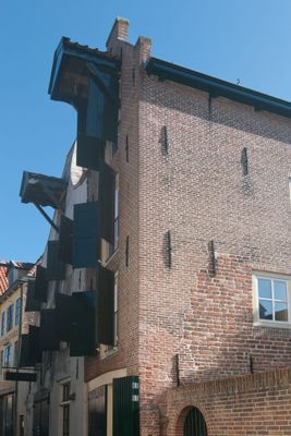 Pakhuis met aan de gasthuissteeg een puntgevel met ezelsruggen en bakstenen tweelichtskozijnen