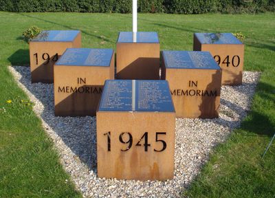 The HAL-monument consists of six metal rectangles featuring plaques with names and text displaying '1940 IN MEMORIAM 1945 IN MEMORIAM 1940' from left to right.