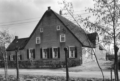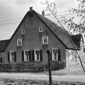 Boerderij onder hoog, rieten zadeldak en aan de voorzijde ijsselstenen puntgevel met rode vensterstrekken